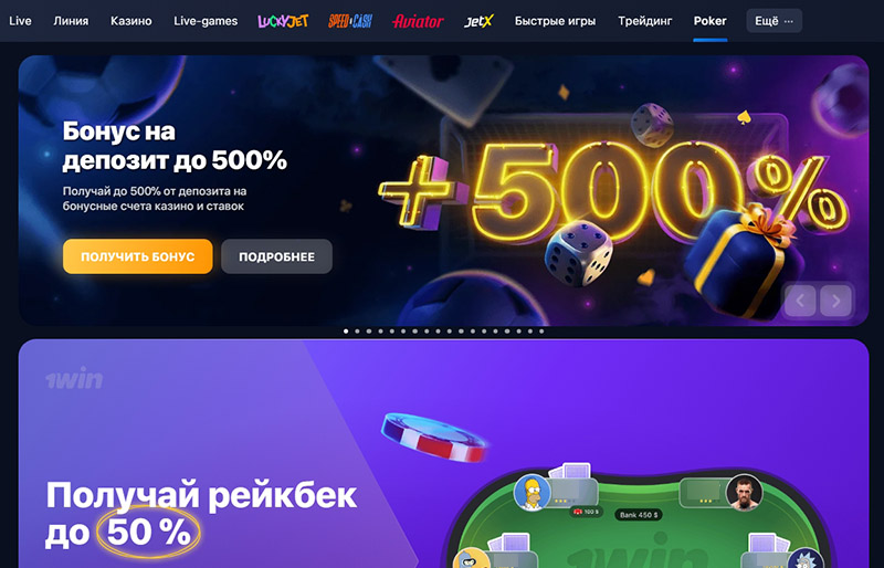 1win — это компания, начинавшая в 2016 году как букмекерская контора. Позднее было добавлено онлайн-казино, а затем и покер. Разработчики не делают отдельных сайтов для разных видов игр. Все собрано на одной площадке.