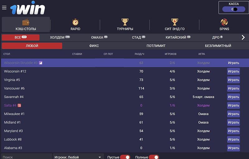 Доступны столы стада в классической версии, а также Хай-Лоу и Разз. Клиенты могут играть в 1win покер на официальном сайте по фиксированным ставкам от $0.05/$0.1 до $1/$2.