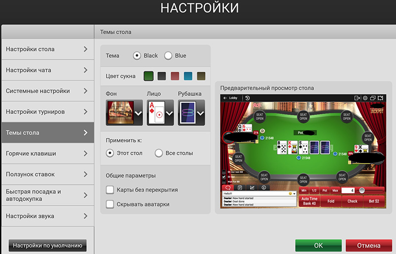 - Темы стола. Можно установить внешний вид карт с обеих сторон, а также цвет сукна столов и окружения.