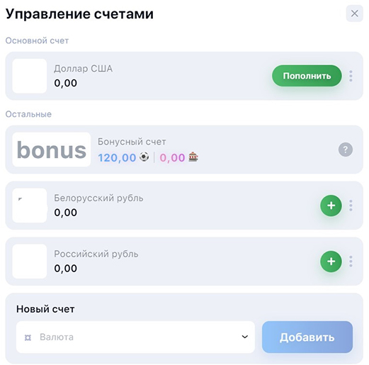 Особенностью рума является возможность использовать одновременно несколько счетов в разной валюте. Добавить их можно во вкладке «Управление счетом».