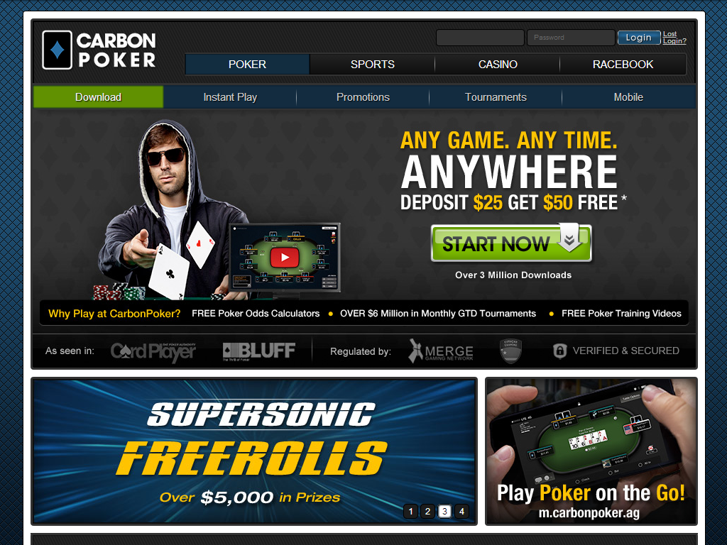 В Carbon Poker предусмотрен 100 процентный бонус на первый депозит, его сумма может достигать 1000 долларов. За следующие пополнения также даются дополнительные дивиденды до 250 долларов.