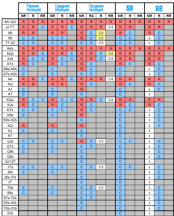 В чарте видно, что к розыгрышу допускаются 14% карманных карт с рейзом. Повышать следует на 3 больших блайнда. А на средней позиции количество разыгрываемых рук увеличивается до 15 процентов с таким же размеров рейза.