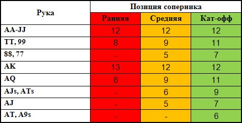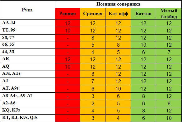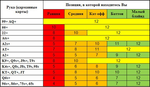 В покере ситуация за столом может развиваться по-разному. Иногда у игроков может оказаться малое количество фишек, из-за чего некоторые рейзы оказываются бесперспективными и даже убыточными. В подобных случаях рекомендуется придерживаться тактики пуш-фолд, когда у покериста только два варианта действий: ва-банк или фолд в зависимости стартовых рук. Если ход делается первым, то нужно следовать инструкциям следующей таблицы.