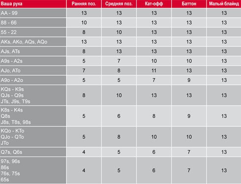 Рекомендуется в покере олл-ин делать и при слабых картах, но находясь на поздней позиции, когда уже оппоненты сказали свое слово. Ниже представлен чарт стартовых рук при использовании пуш-фолд.