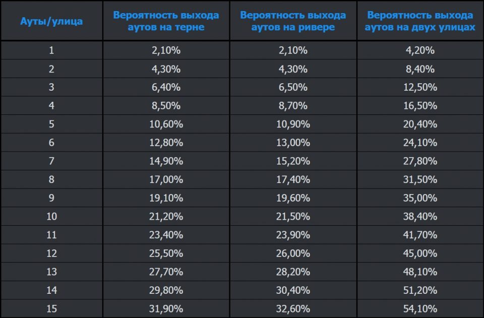 Напоследок таблица аутов в покере, в ней указаны вероятности получить нужную карту на последних этапах торговли в процентном соотношении.