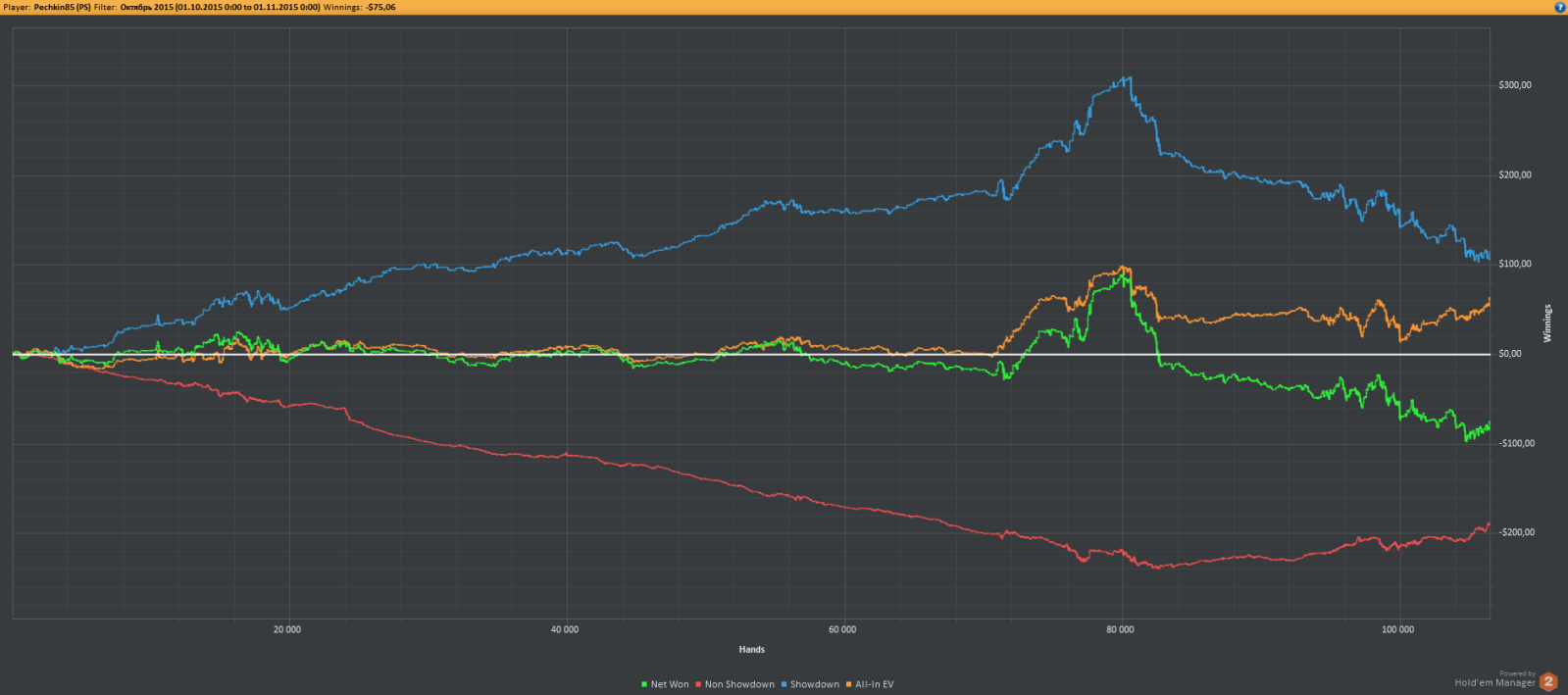 Дисперсия – это отклонение от математического ожидания в ту или иную сторону. Если представить график плюсового игрока, то по идее он должен идти вправо и все время стремится вверх. Так было бы в идеале. Однако на самом деле линия будет волнообразная, она будет то падать, то подниматься, причем довольно таки резко. Подобные перепады называются апстриками и даунстриками, первые удачные сессии, вторые неудачные.
