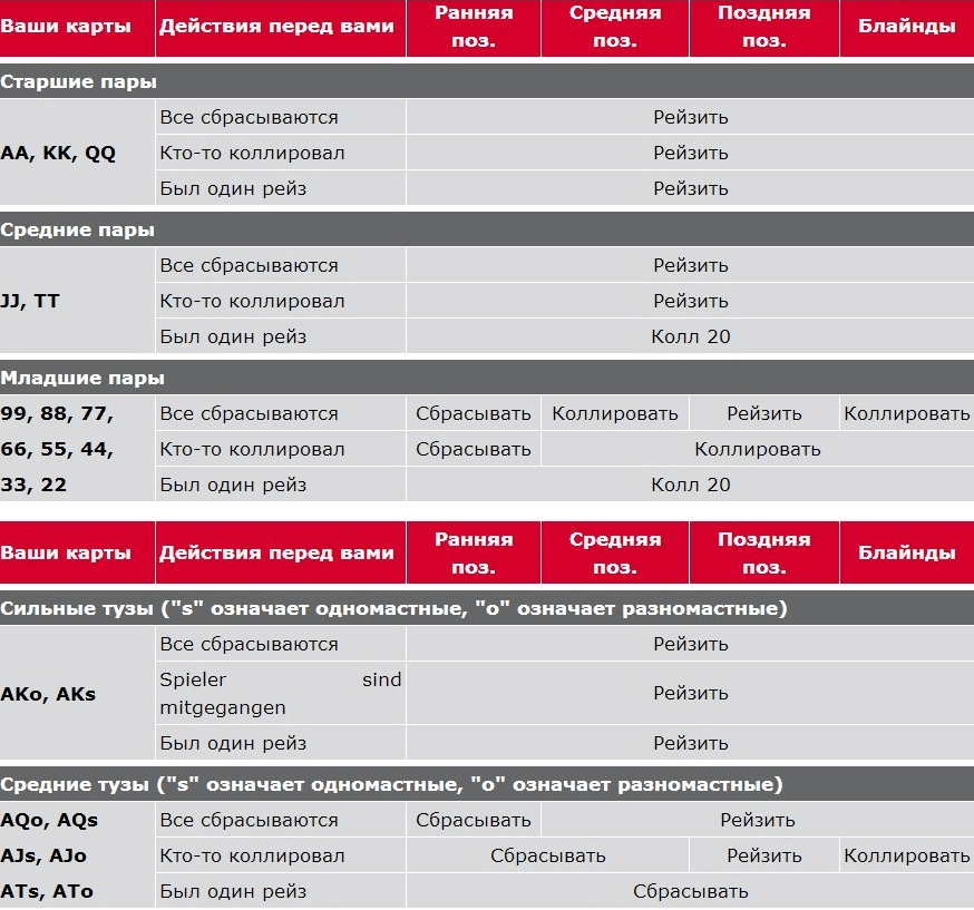 Не всегда новички умеют правильно оценивать карманные карты и принимать верные решения, в этом случае им лучше пользоваться таблицей.