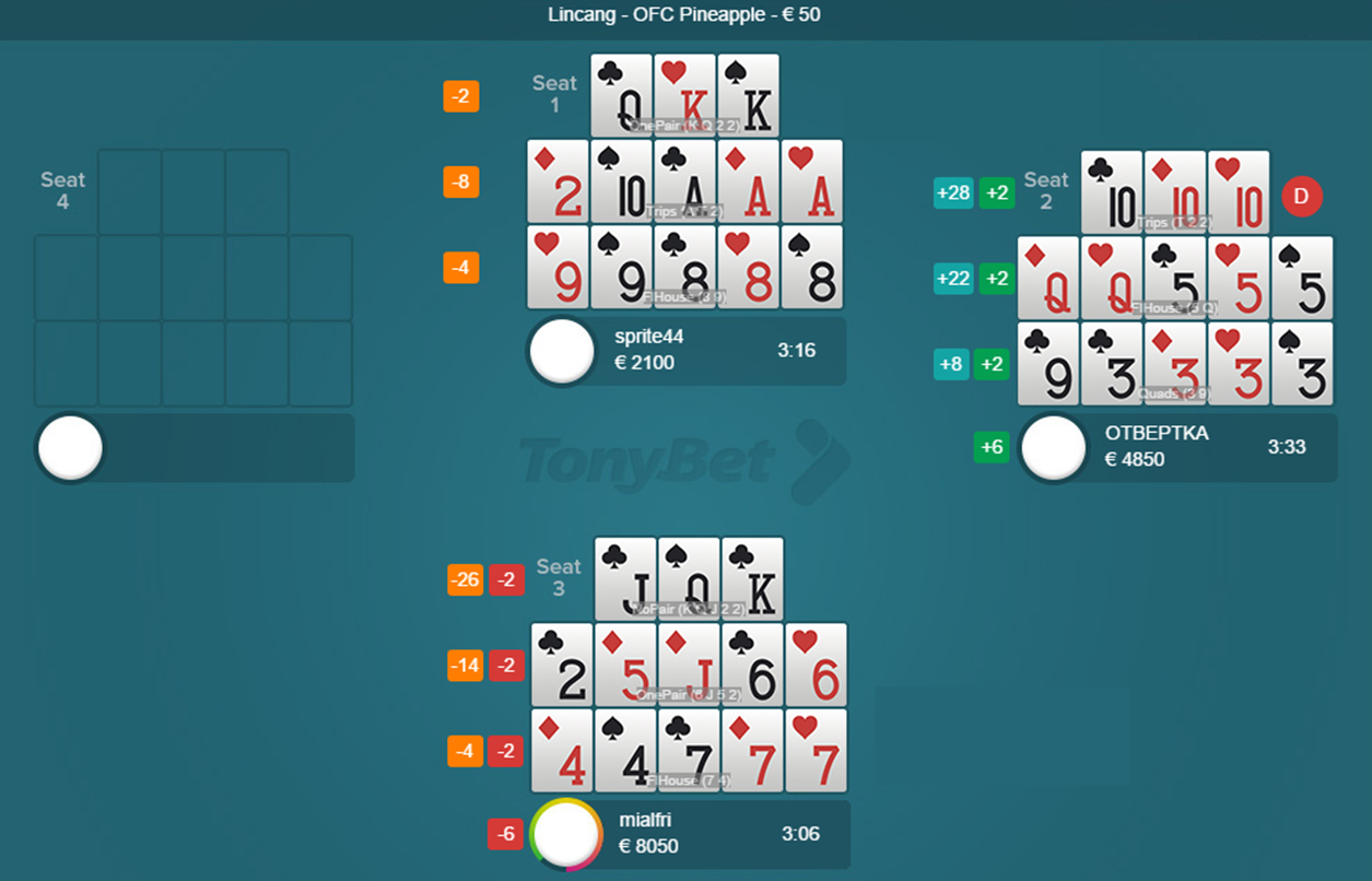 В китайском покере ананас и других открытых разновидностях перед пользователем находится три ячейки, в них и нужно раскладывать карты. В верхнюю три элемента, в два нижних по пять. Причем все они должны образовать комбинации, главное правило – сочетания обязательно нужно разложить сверху вниз по старшинству. То есть наверху слабейшая комбинация, в средней сильнее, внизу самая сильная. Допускаются одинаковые сочетания в двух рядом стоящих боксах, например, в среднем и нижнем, либо в верхнем и среднем. Если это правило нарушается, рука объявляется «мертвой», а игрок проигравшим раздачу.
