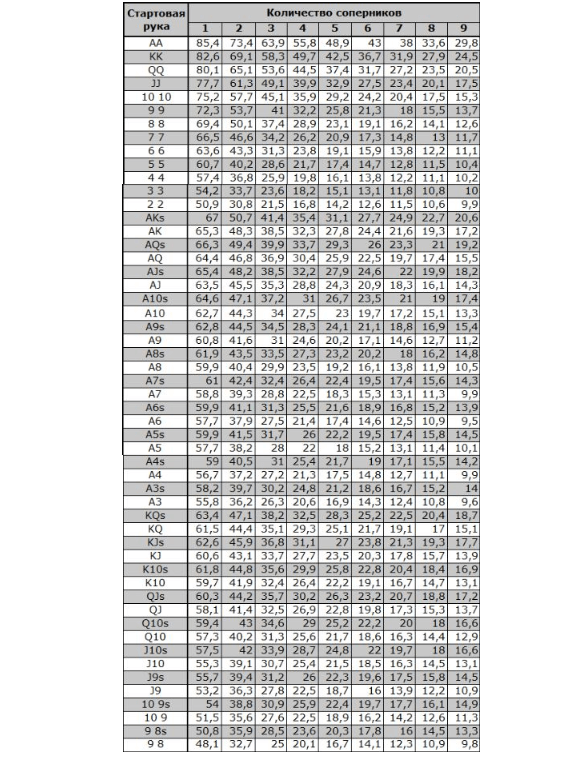 Ниже представлена полезная префлоп-таблица, в которой представлены шансы победить в зависимости от количества оппонентов и силы карманных карт. В ситуации, когда все сделали ва-банк в первом раунде торгов.
