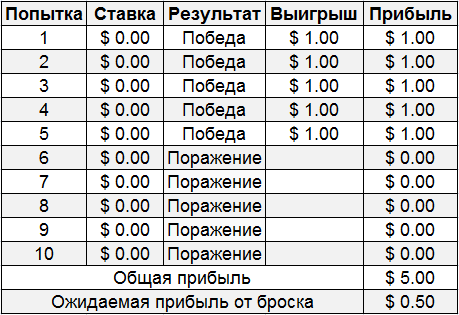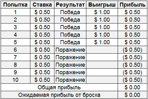 Чтобы посчитать эквити, потребуется разделить полученную прибыль на общее количество подбрасываний: $5/10, что даст в результате $0,5, это и есть профит с каждой попытки. Для наглядности следует взглянуть на таблицу: