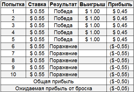 Однако изменим условия. Теперь за каждый бросок необходимо платить 50 центов, а за каждого орла по-прежнему начисляется $1. В итоге выигрыш составит те же 5$, однако его «съедят» неудачные серии. Игрок в этом случае выйдет в ноль, то есть ничего не получит, но и не проиграет.