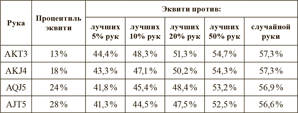 Но считать, что эквити в покере показывает стопроцентные результаты, тоже нельзя. Всегда будут случаи, когда покерист ответит уравниванием или повышением с двумя тузами 10 раз подряд, и все эти попытки проиграет. Но это не значит, что ход оказался негативным, просто сказывается еще и дисперсия, точно вычислить ее можно лишь на очень длительной дистанции, желательно не менее чем на 10 000 отыгранных рук.