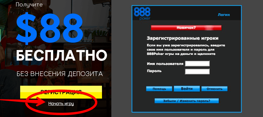 Пользователь может внести депозит, на него положен бонус в размере 100% до 400 долларов и играть на эти деньги. Либо воспользоваться особым предложением от 888Poker и получить 88 долларов на счет без внесения денег.