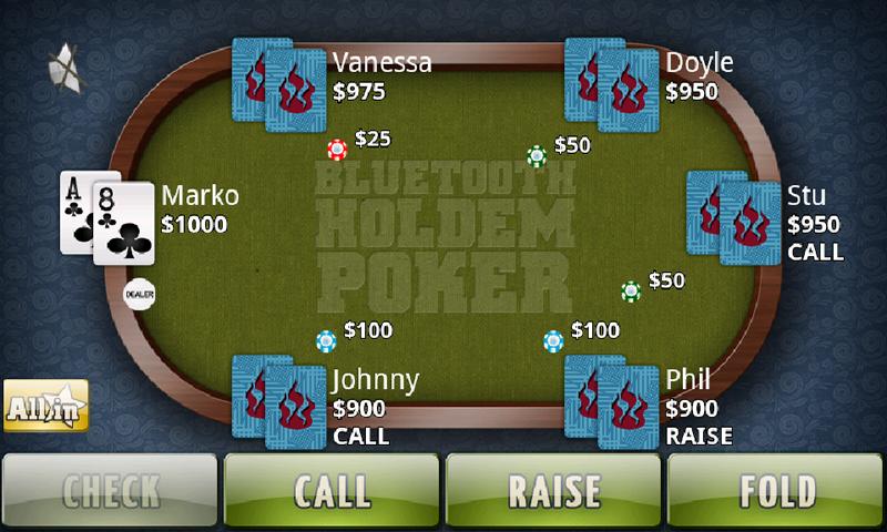 Для игры в мультиплеерном режиме понадобится включенный блютуз у всех пользователей. Далее игроки должны подсоединиться друг к другу, тот, кто создал стол, имеет право производить настройки на свое усмотрение. Он может добавить нескольких «ботов», чтобы было интересней, установить размер обязательных ставок и время их повышения.