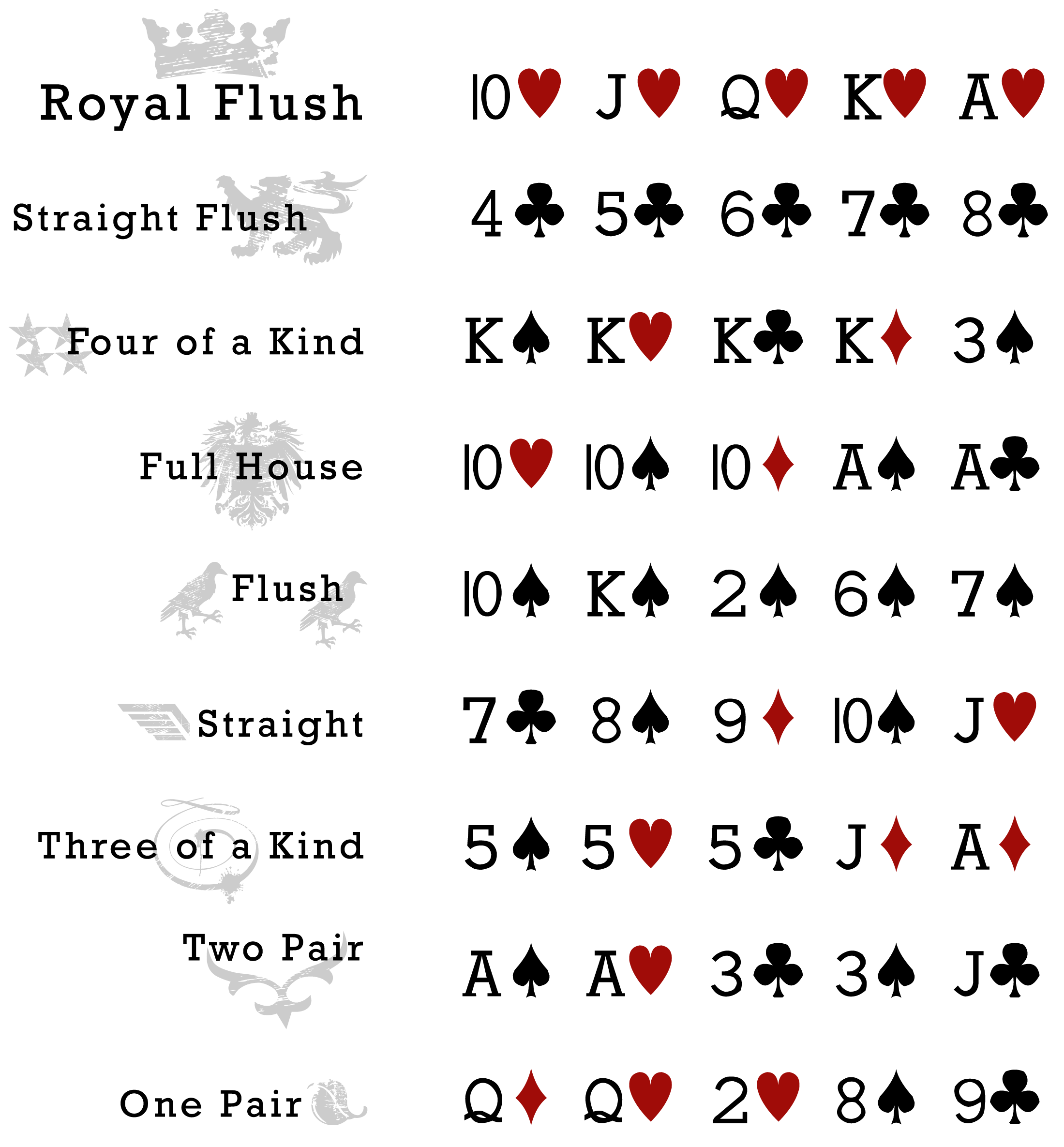 Во многих покерных дисциплинах приняты десять сочетаний, ниже приведен их список в порядке возрастания силы.