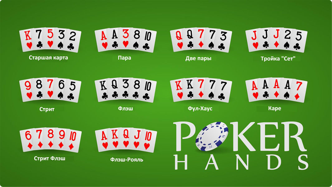 Изучая, как играть в покер для начинающих, именно комбинации следует рассматривать с картинками, чтобы легче запомнить каждый пункт.