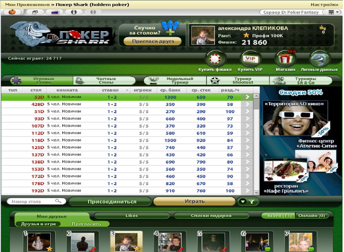 Благодаря ПокерШарк можно сразиться с друзьями в покер. Регистрироваться в системе нет необходимости, достаточно авторизоваться через любую доступную социальную сеть.