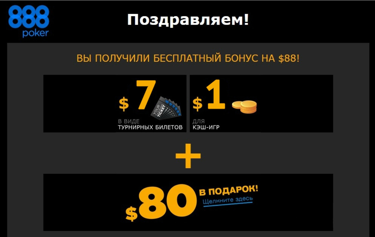 - 88 долларов без депозита от 888Poker. Это самое известное предложение во всем мире от ТОП рума планеты. Заведение готово безвозмездно поделиться 8 долларами на счет и 80 билетами на турниры, бонус начисляется частями по мере нарабатывания рейка.