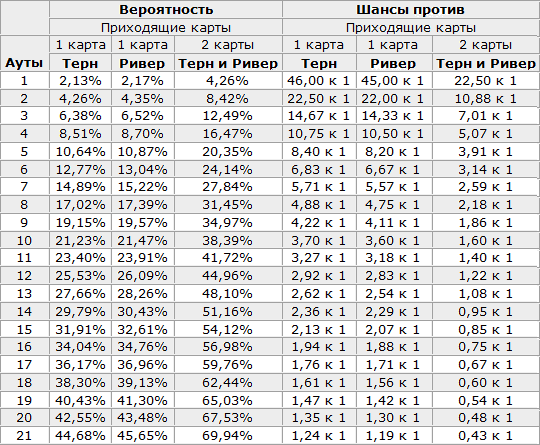 Для точного вычисления шансов на победу, игроку необходимо в первую очередь узнать, какое число аутов осталось в колоде, которые смогут завершить комбинацию.