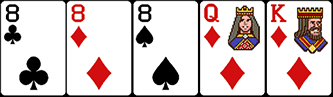 На русском Тройка, Сет, Триплет. Комбинация состоит из трех карт с одинаковым номиналом, еще две идут в роли кикеров. Например, туз бубен, туз треф, туз пики плюс 6 бубен, 10 треф. Старшинство сочетания определяется по рангу трех карт.