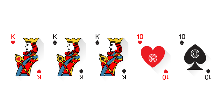 В poker комбинация состоит из трех карт одного достоинства и двух других, любых карт. Например, три туза, три семерки, три шестерки и так далее.