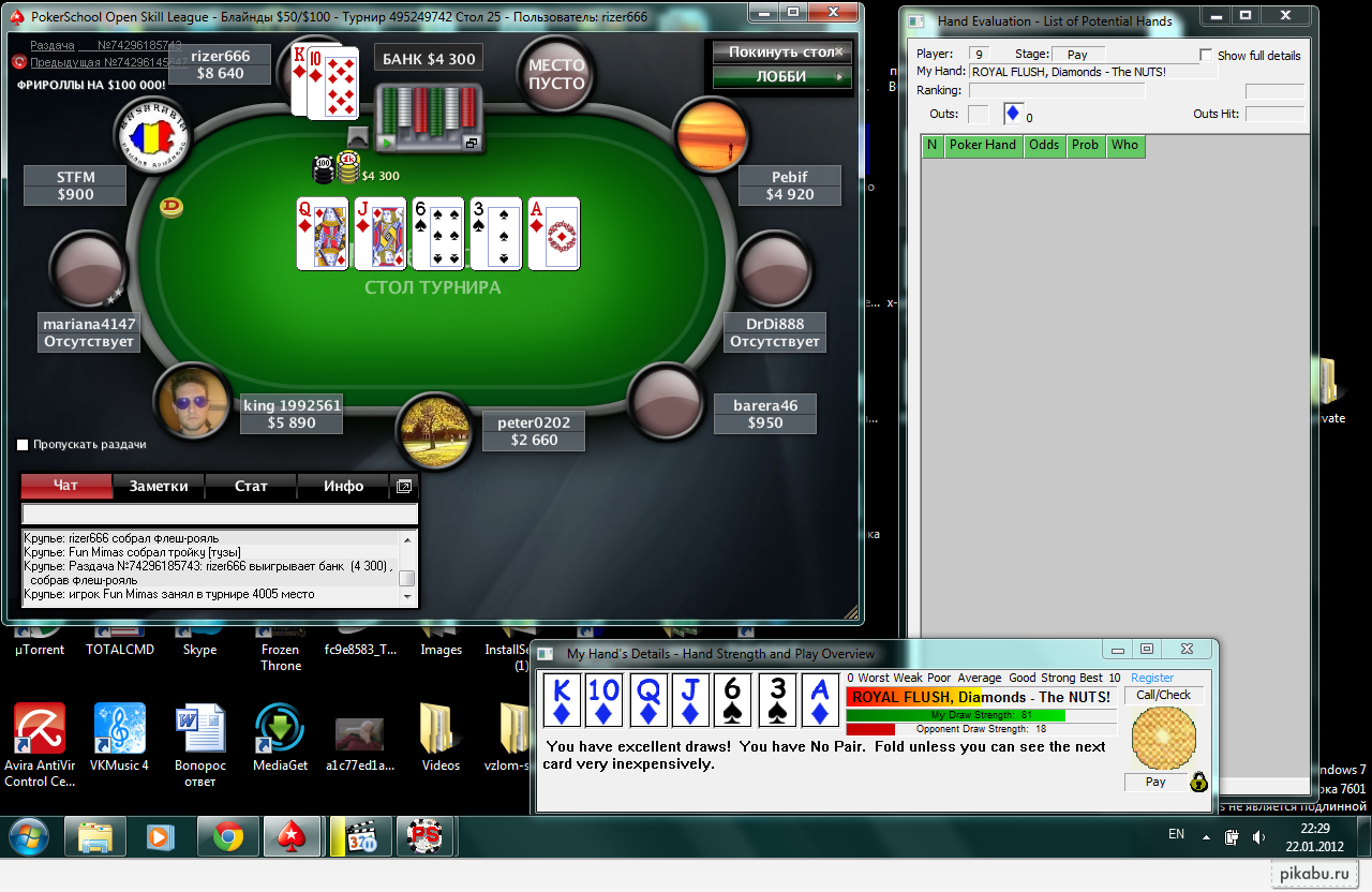 Если после флопа на руках у игрока оказались две карты, потенциально могущие составить Рояль Флеш, это будет уже 0,0008 процентов вероятности. Тоже не слишком обнадеживающий показатель.