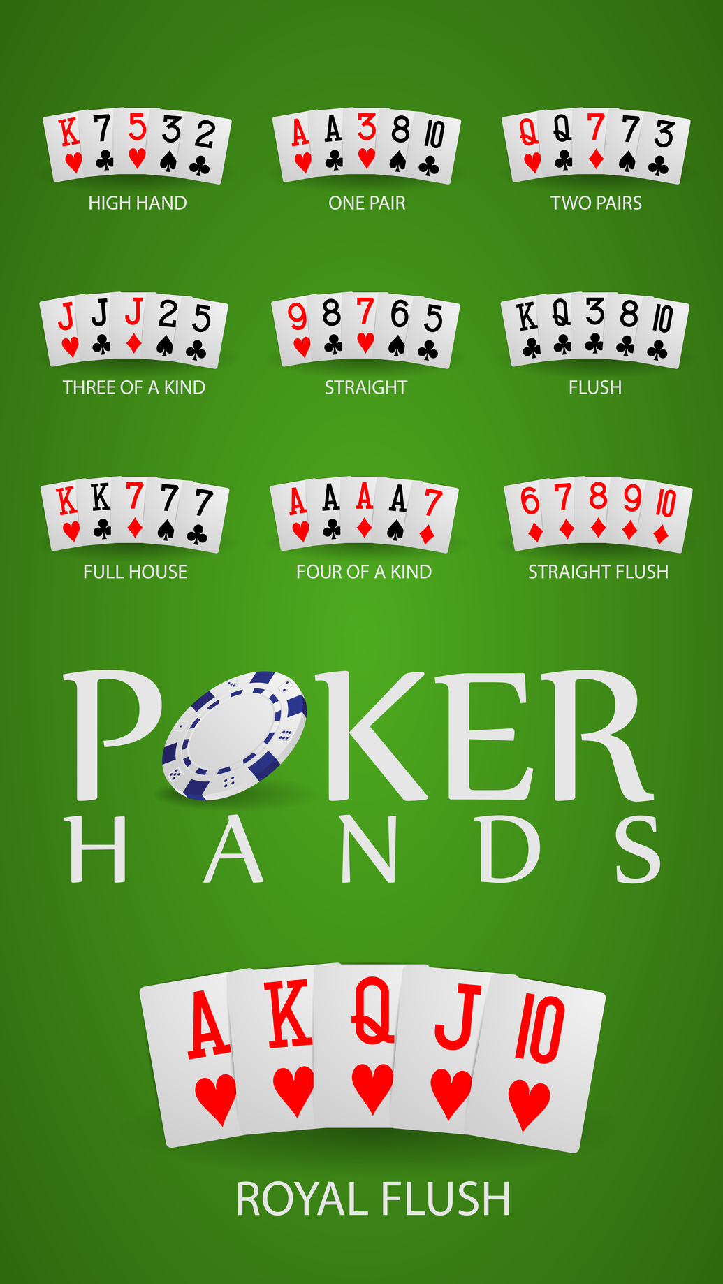 Перед Рояль Флеш располагаются еще девять комбинаций, они тоже неотъемлемая часть покера, знать их обязательно для каждого игрока.