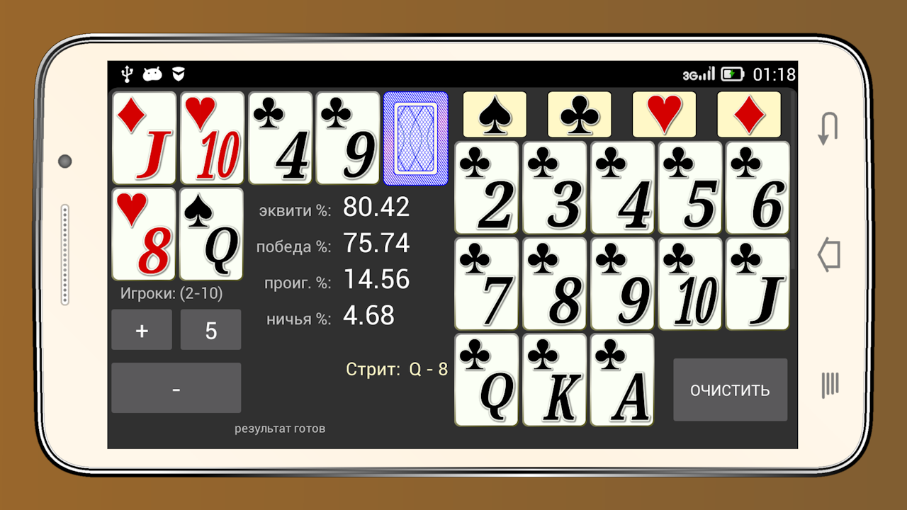Калькулятор также способен высчитывать вероятности рук у оппонентов в зависимости от текущего раунда розыгрыша. А если ввести финансовую статистику, приложение рассчитает еще и показатели эквити, что позволит вести еще более успешную игру.
