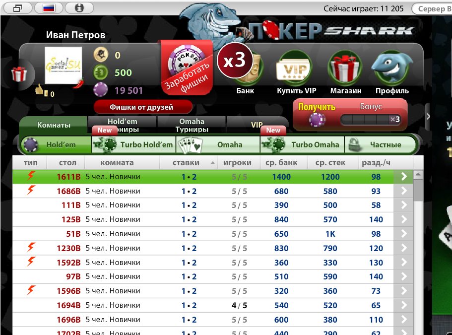 В самом верху слева игрок может найти логин и аватар, с помощью которых он авторизовался в системе. Тут же представлена информация о количестве фишек на счету. Рядом находится рисунок сейфа, если нажать на него, то осуществится переход в магазин, в нем можно докупить фишки и золотые монеты за реальные деньги.
