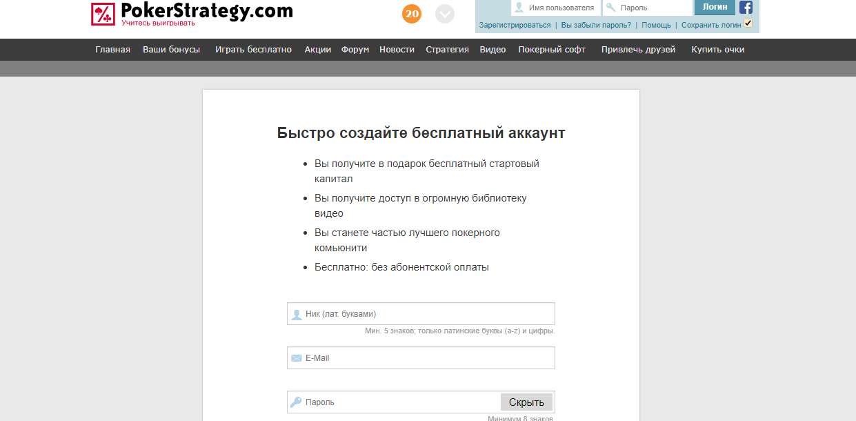 Регистрация на Стратеджи Покер идет по классическому сценарию, принятому в большинстве ресурсов. Клиенту достаточно указать желаемый логин и пароль и действующий адрес электронной почты. На нее потом придет ссылка для активации, перейдя по ней пользователь подтверждает профиль и ему открываются все функции школы.