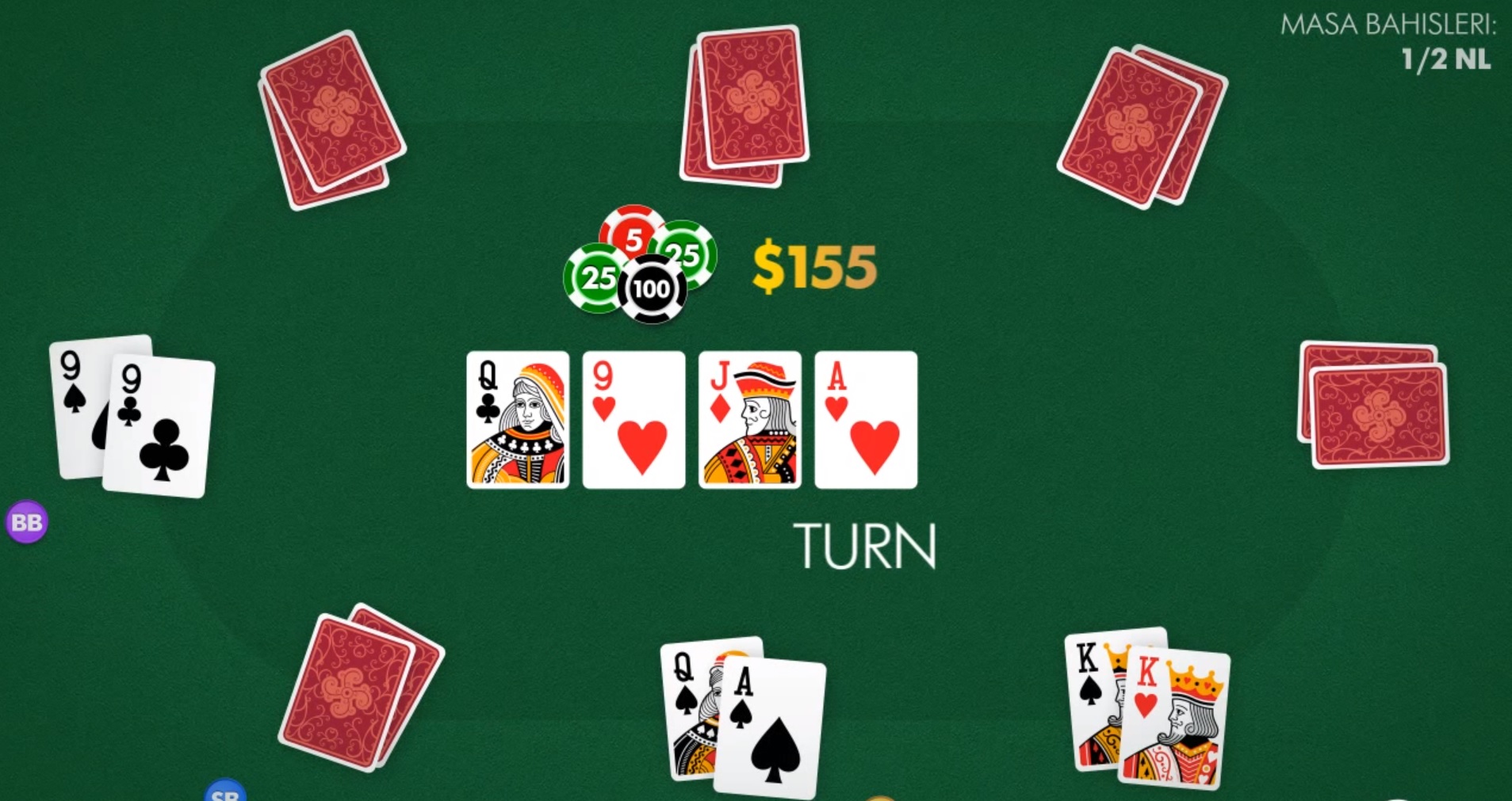 Потом идет этап терн, в котором на столе появляется еще четвертая общая карта, участники проводят еще один круг торговли. Далее ривер – последний этап, на борд кладется пятая общая карта, а игроки вновь начинают торги.