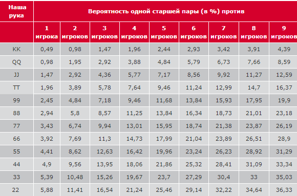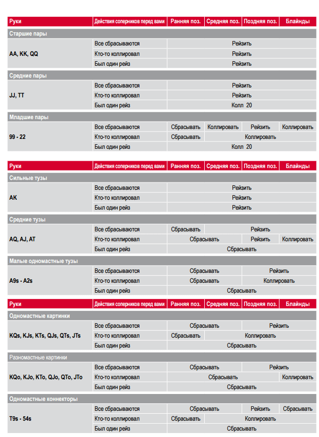 Например, будет дана задача: пара карманных валетов и поздняя позиция, как правильно поступить? В этом случае стоит ориентироваться на следующую таблицу, в которой наглядно представлены конкретные карты, позиция и оптимальные ходы.