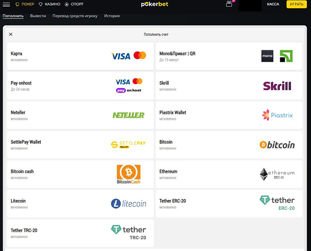 Покер-рум ПокерБет не берет комиссию за пополнение и вывод денег. Лимиты зависят от выбранного способа. Минимальная сумма депозита составляет 50 UAH, максимальная — не ограничена в некоторых методах. Для кешаута нужно иметь на соответствующем балансе не менее 500 UAH.