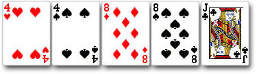 Комбинация состоит из двух пар карт. В каждой паре две карты одинакового достоинства. Пятая – дополнительная, вступает в игру только в спорных ситуациях. Вариант Две пары: два туза и две дамы, две тройки и две семерки.