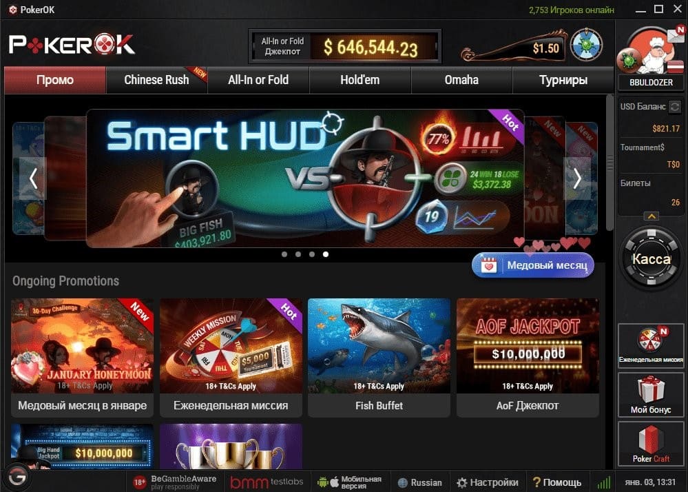 PokerOK – покер-рум со слабым полем, качественным софтом и выгодной бонусной системой. Для игры доступно десятки кэш-столов и турниров в любое время. Площадка подойдет как для начинающих игроков, так и для продвинутых покеристов. Регистрируйтесь в PokerOK и приступайте к игре!
