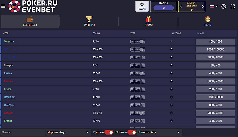 - Доступны кэш-столы и ивенты с быстрым покером.