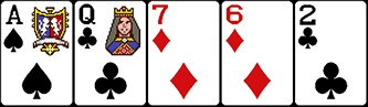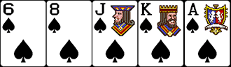 Комбинацию в принципе нельзя отнести к выигрышным сочетаниям, это просто случайный набор пяти карт, никак не связанных друг с другом. Такая ситуация случается чаще всего, здесь все карты выступают в роли кикера. Небольшой пример: 6 бубен, 8 червей, 10 треф, туз пики, валет пики.