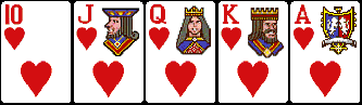 Символ покера, королевская комбинация. Желанный набор для всех игроков. Сочетание, по сути своей, самый старший Стрит Флеш, состоит из пяти карт одной масти от 10 до туза. Небольшой пример: 10 пики, валет пики, дама пики, король пики, туз пики.