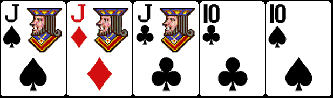 «Полный дом» – так переводится комбинация с английского, и не зря. Сочетание содержит в себе три карты с одинаковым рангом плюс еще две тоже идентичные по номиналу. Можно сказать, что набор состоит из Триплета и Пары. Небольшой пример: король червей, король пики, король бубен + 6 пики, 6 треф.