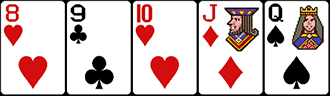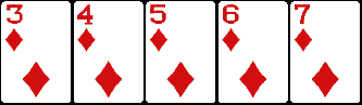 Невероятно трудная комбинация для составления, собирается из пяти карт, идущих одна за другой по номиналу + все должны быть одной масти. Туз традиционно может засчитываться и как единица (туз,2,3,4,5), и как самая старшая карта в сочетании. Небольшой пример: 7 бубен, 8 бубен, 9 бубен, 10 бубен, валет бубен.