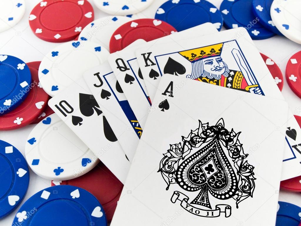 - Роял Флеш. В принципе это старший Стрит Флеш, но принято выделять в отдельную комбинацию. Королевское сочетание, выпадающие крайне редко и приносящее стопроцентную победу. Это набор пяти самых старших карт одной масти, начиная от десятки и заканчивая тузом (10 треф, валет треф, дама треф, король треф, туз треф).