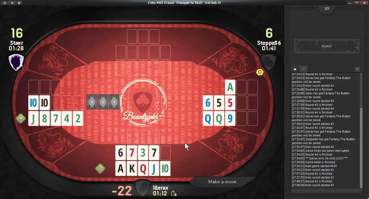 Раунд длится пока все не соберут на своих боксах по 13 карт. Потом идет вскрытие карт, у кого лучше сочетания, тот и празднует победу.