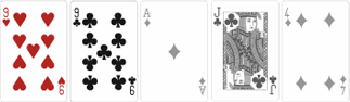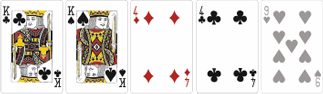 По две пары карт с одинаковым достоинством. Для примера: два туза и две дамы, две десятки и два короля. Пятая карта считается запасной и используется только в спорных случаях.