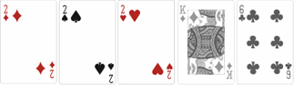 Комбинация состоит из трех карт с одинаковым рангом и двух дополнительных, не участвующих в Сете. Для примера: три короля, три восьмерки, три дамы. Сочетание обозначают от номинала карт, Сет из трех вальтов, Сет из трех восьмерок к примеру.