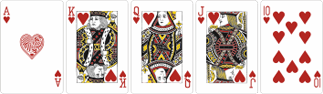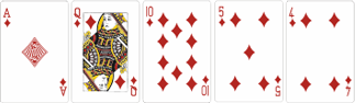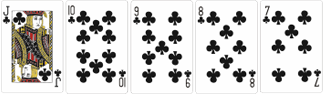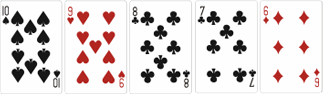 Эта комбинация составляется из пяти карт разных мастей, следующих по порядку. Для примера: 6 бубен, 7 пики, 8 червей, 9 пики, 10 треф. Сочетанию дается название от старшей карты в руке, в случае с примером это будет Стрит от десятки. Туз может выступать как единица (туз, 2,3,4,5) и как высшая карта (туз, король, дама, валет, 10).
