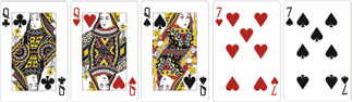 Эта комбинация объединяет в себе две другие: Тройку и Пару. То есть состоит из трех карт с одинаковым достоинством плюс еще две с одинаковым номиналом. Для примера: три шестерки и две двойки. По признанию покеристов, сложнее собрать, чем даже Каре.