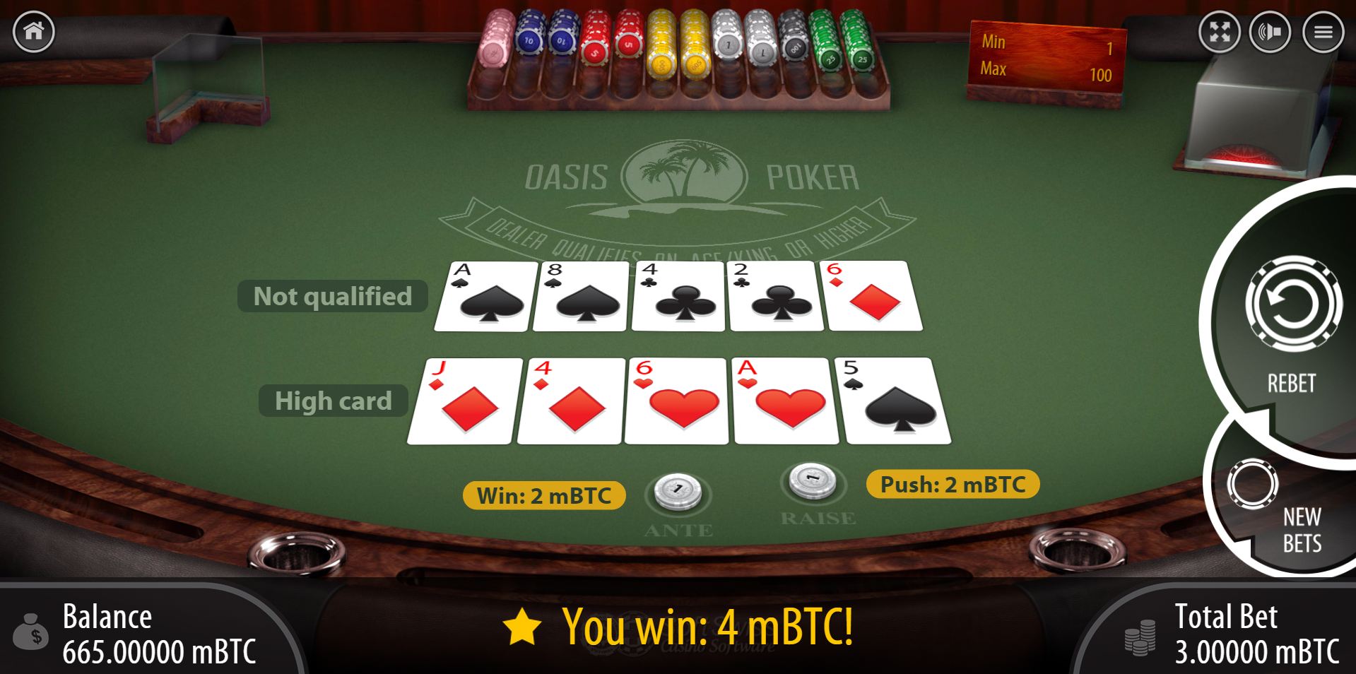 В Оазисе из правил покера позаимствованы только комбинации и принцип определения победителя – кто собрал лучшее сочетание карт, тот и празднует победу и забирает деньги.