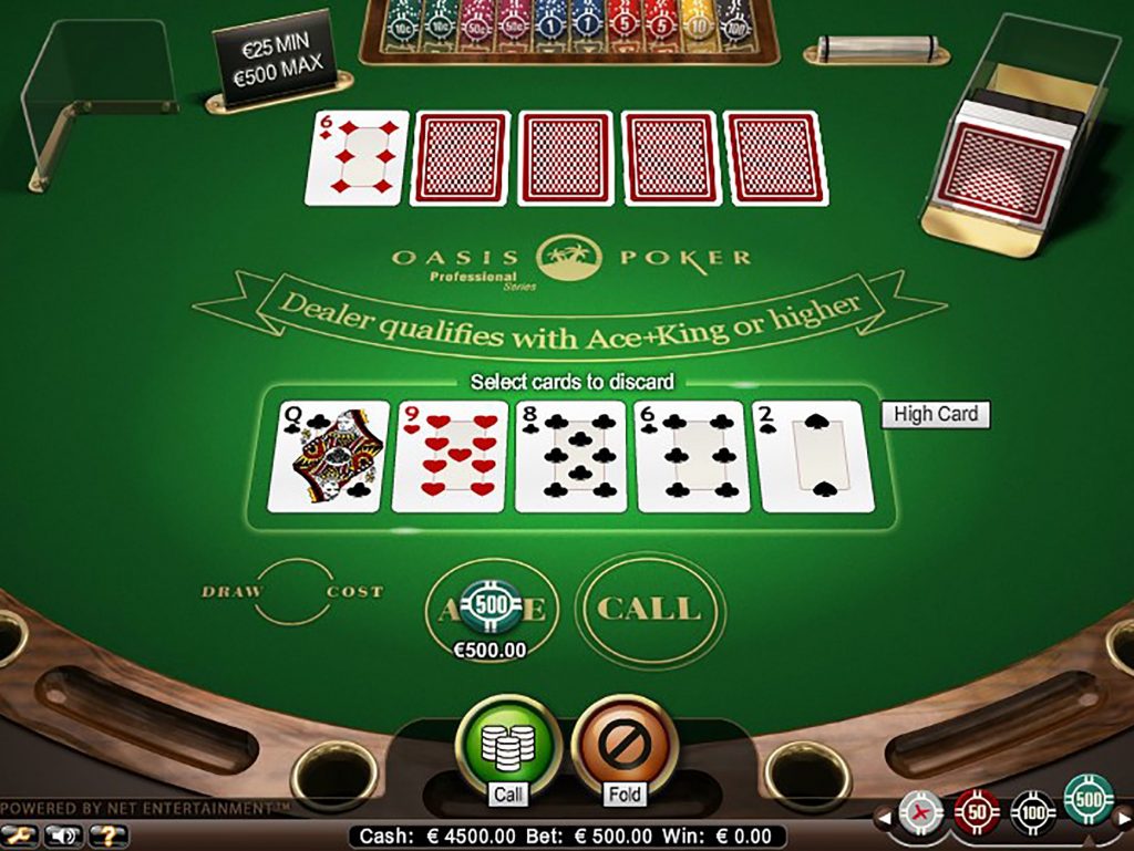 Игру Оазис лишь условно можно назвать разновидностью покера, на самом деле она больше похожа на игровой автомат, где все решает случай и удача пользователя. По этой причине развлечение нельзя найти в онлайн-румах, встречается оно только в казино в соответствующем разделе «Видеопокер», реже в «Вегас».