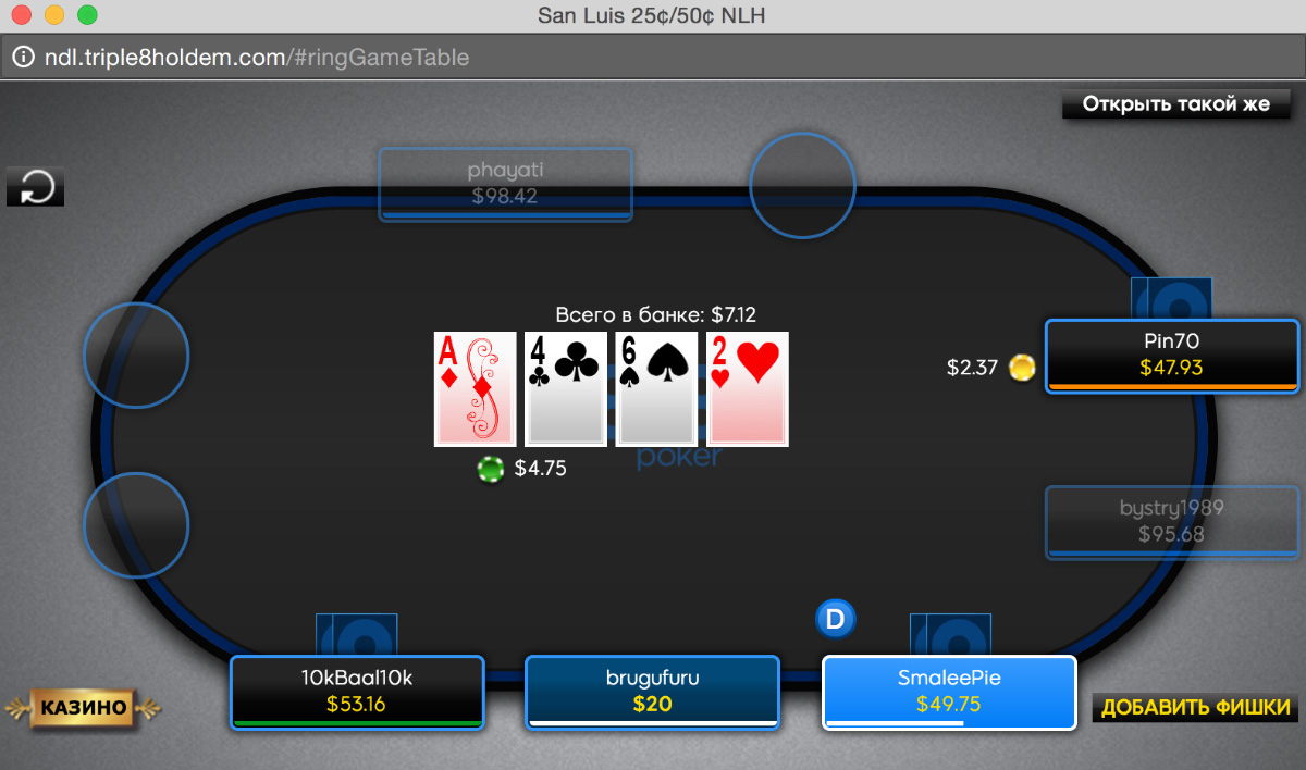 Стол с непосредственной игрой отображается очень просто без лишних элементов. Есть только крупные кнопки для определенных действий, чат с другими пользователями, несколько вариантов отображения карт. Но это скорее преимущество, ничего не отвлекает от процесса.