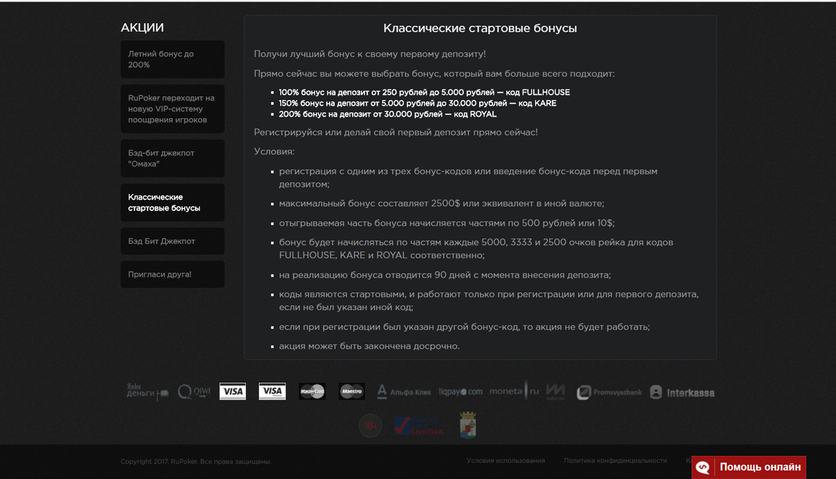 Заведение предоставляет всем новым клиентам классические стартовые бонусы, нужно лишь указать промокод на RuPoker при регистрации и нажать на кнопку «Активировать бонус». Бонус-коды бывают нескольких видов: